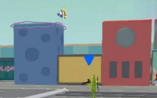2、敌方那两个最高的台子上:和我方的情况不一样,敌人待在他们自己的台子上时,想直接把炮弹打在平面上不太现实,得找准敌人跳跃的时机,瞄准边边打,就像紫色圈圈标出来的位置,往这儿打就行。