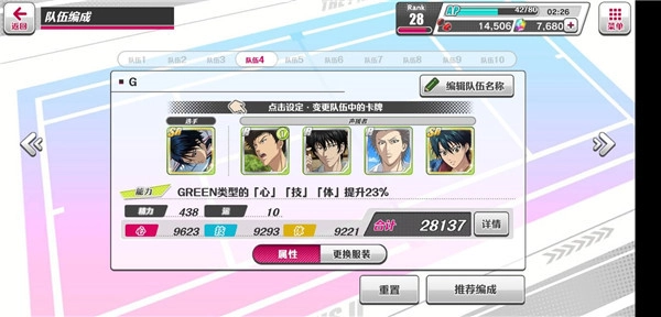 进入游戏后会赠送20连抽,抽完能得到红、蓝、绿三种颜色的卡牌。我们可以先点击卡牌,再进入队伍编成界面选择推荐编成,根据分类组建四支队伍,这样就能匹配每首歌的需求了。