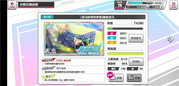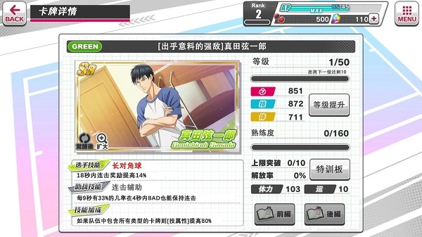 玩了一阵子后,我们会攒下不少育成点和特训道具,想刷高分可别忘了提升属性哦。具体操作是点击卡牌→所持卡牌→特训板,升到一定等级后,SR和SSR卡牌还能觉醒新卡面。另外,如果重复抽到相同的卡牌,特训板会自动延长呢。