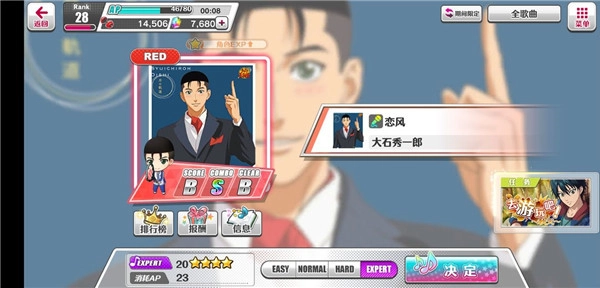 歌曲分类包括通常、活动、期间限定、限定每月更换这几种类型,本月的限定歌曲即将结束,大家别忘了把大石的《恋风》通关呀。另外,挑战ex难度时要是没把握,可以组一套带生命恢复效果的卡组来保命,毕竟这游戏没通关不仅会扣体力,还拿不到奖励,实在不划算。