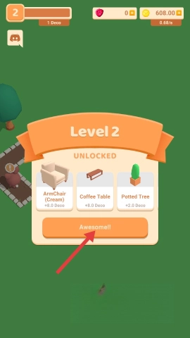 升级到等级2之后,记得点击“Awesome!!”,这样就能解锁扶手椅、咖啡桌这类新的装饰品了。