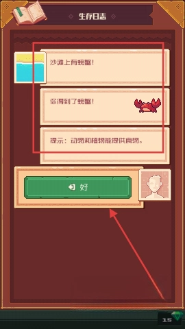 生存日志提示沙滩上有螃蟹,快去找它们吧!了解动植物能提供的食物,点击【好】继续游戏,保存你的精力。