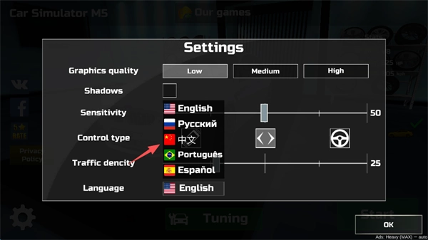 点击屏幕下方“Language”右侧的“English”,将其更换为中文。