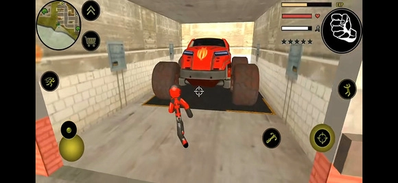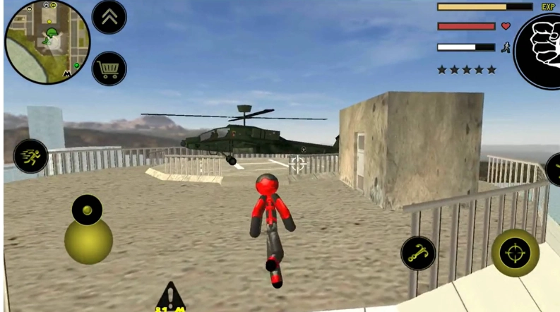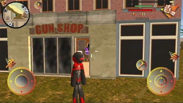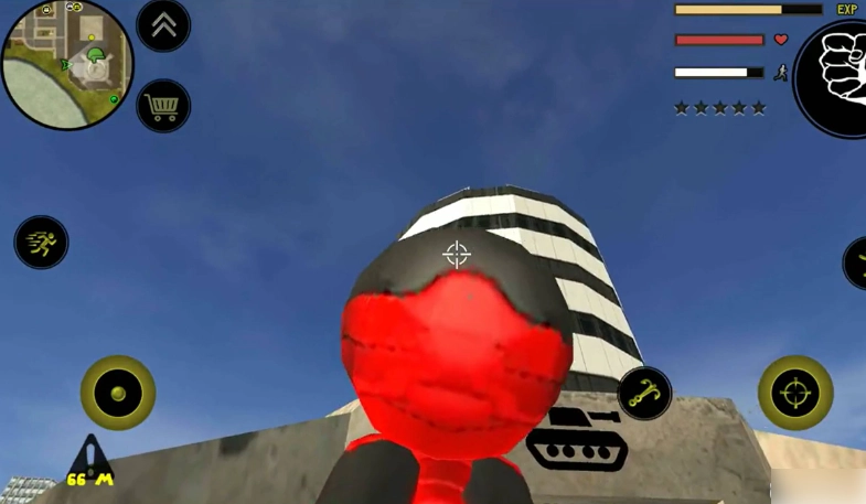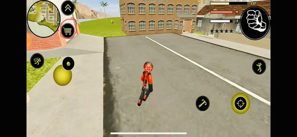 左侧控制移动与加速,右侧负责绳索操作和攻击(含跳跃功能),跳跃键独立设置;画面右上侧的武器切换、血量与经验值均实时刷新,状态信息一目了然。玩家可自由选择玩法,与其他帮派成员展开交火——击杀敌人能获取经验,连续击杀会累积星级,此时警察及周边角色会重点针对你发起猛烈攻击。如何在激烈对抗中存活下来,并成功消灭对手,便是你需要完成的核心任务。