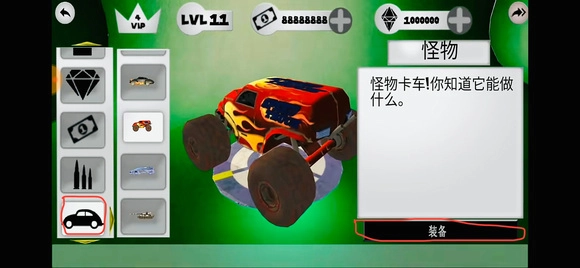 步骤二:拉动最左列图标找到“汽车类”,挑选自己喜欢的车型,点击右下角的“装备”(我们以怪物车为例)。