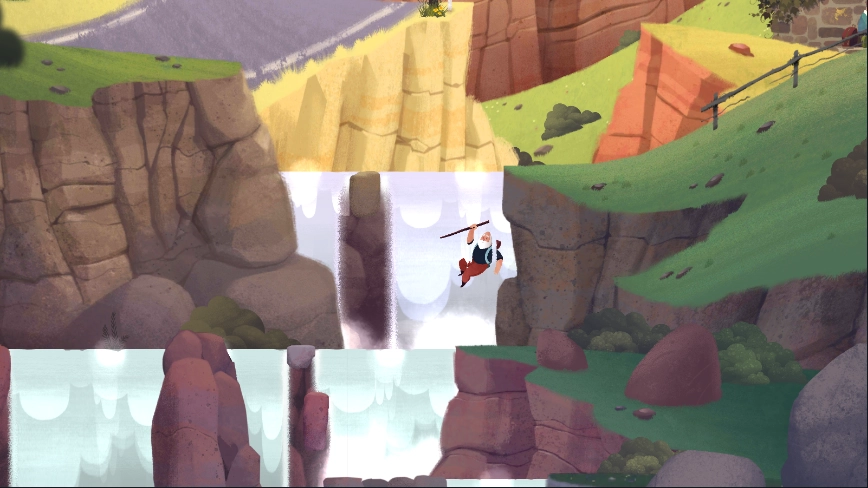 切换到下一个场景后,对水面执行点击操作,老人踏上水面便会开始坠落,最终抵达最底层。