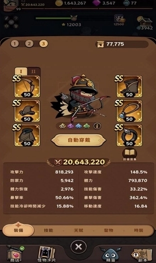 很幸运在中期还拿着法杖的时候,就抽到了三星SS级的红色不死族蜘蛛,这也是当初我选择弓而非短剑的主要原因之一。基本配置和武器8卡开2阶四个技能的情况一样,我是无脑往里面塞加攻击力属性的卡片。优先选的属性是:村庄外围x4——SS阶级装备穿戴数量每增加1,攻击力就+35%(副武器也会算在里面,所以最多能加到7件);沙漠遗迹x2——当血量低于15%时,普通怪物会直接死亡;蘑菇之森x2——当血量低于30%时,对敌人造成1.2倍的最终伤害。