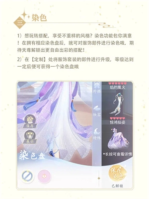 1、想要轻松玩转搭配,每天都能拥有不重样的风格?染色功能绝对能让你满意!只要拥有对应的染色盘,就可以对服饰部件进行染色啦,期待天尊解锁出更自由、更出彩的搭配!
