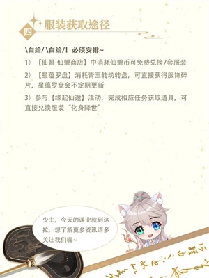 1、仙盟-仙盟商店中消耗仙盟币可免费兑换7套服装