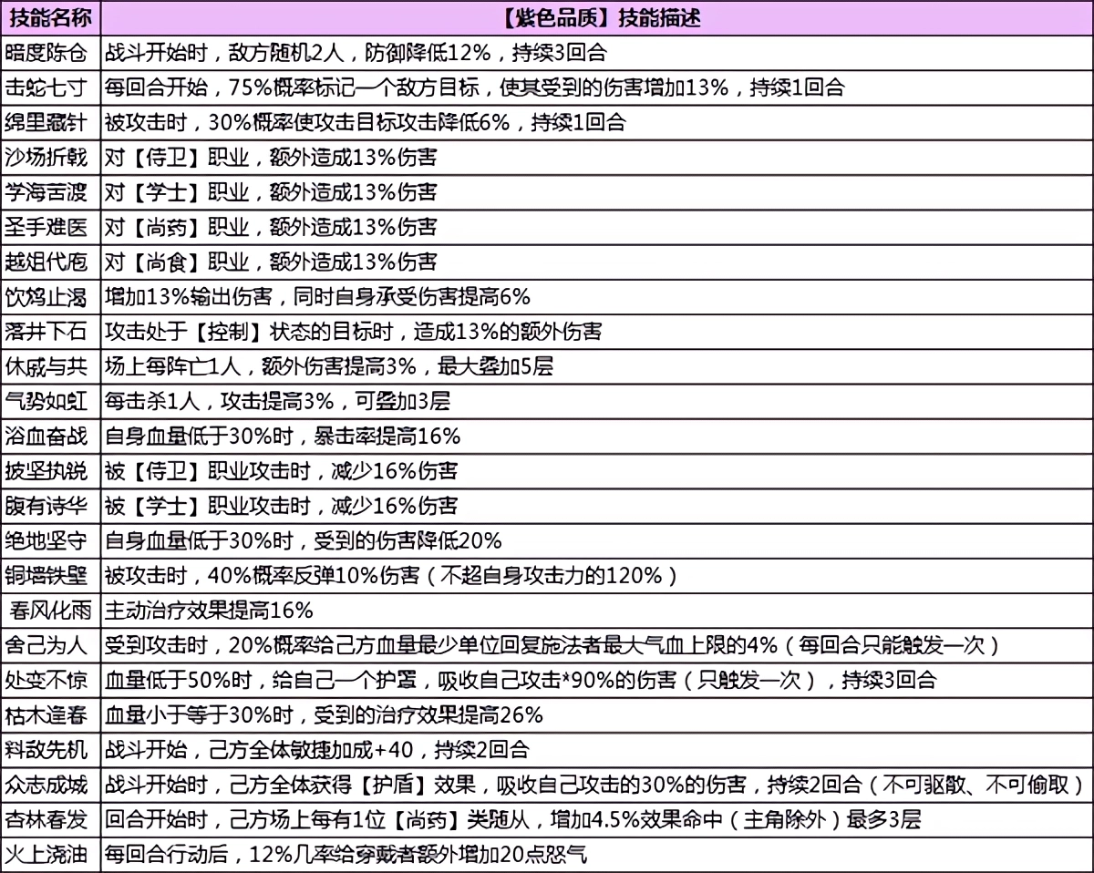 各品质技能效果:橙色品质技能效果紫色品质技能效果蓝色品质技能效果,详细技能效果可查看具体技能描述: