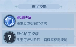 珍宝每次进阶时,都有一定几率得到1个随机品质的随机珍宝技能。珍宝技能的品质包含蓝、紫、橙三类,一旦获得,其品质与效果就不再变动。每个珍宝最多能拥有2个技能。