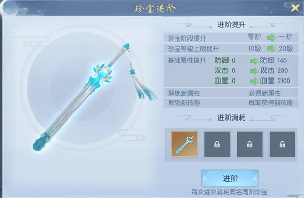 当珍宝等级达到当前阶段的上限时,即可进入珍宝进阶界面。在该界面中,能够提前查看进阶后珍宝的阶数提升情况、新的等级上限以及基础属性数值的变化。