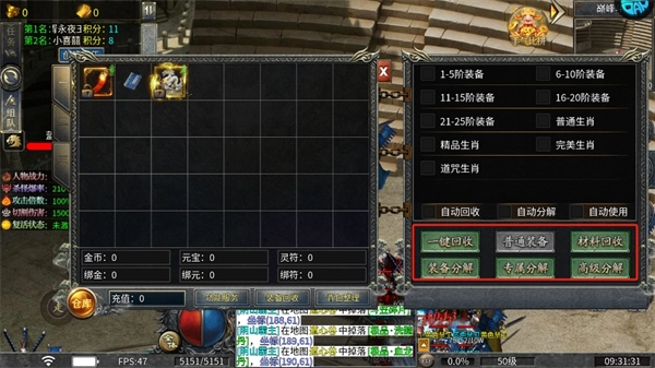 不需要的装备可以一键回收高级分解。