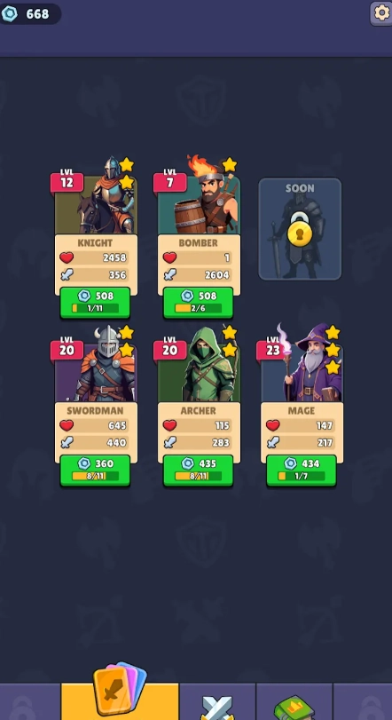 2、招募士兵,根据装备的属性特点进行搭配来组建军队,再通过参与战斗获得资源,以此实现军队的升级。