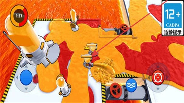 回到熔岩关卡,操控角色靠近火焰区域,利用场景里的装置(比如黄色喷枪),按照箭头指示的方向喷射来灭火。