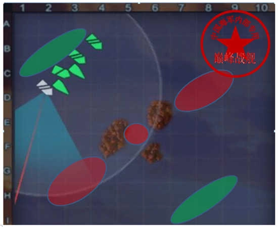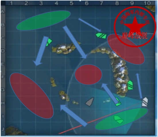 绿色椭圆代表双方的出生地,正中间的红色圆圈是据点,战斗主要围绕这个区域进行。当战斗等级提高时,驱逐舰可以尝试从两边推进,寻找突破的机会。