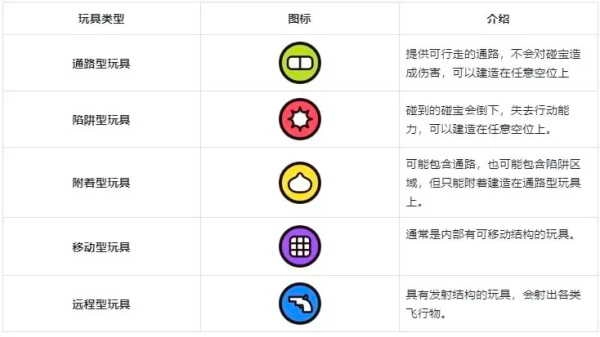 这些玩具分为五大类型:通路型、陷阱型、附着型、移动型和远程型。请参考下图了解详情哦!