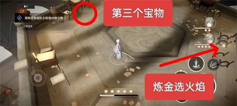 5、找四个宝物按着光点点完两个,然后去升降台到上层左边拿了第三个宝物再去右边炼金台选择火焰。任务完成!