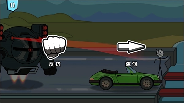 1、玩家启动游戏后点击开始按钮,游戏内的火柴人会被机器人追至断桥边缘,此时玩家能选择奋起反抗或是跳河逃生,不同的选择将导向不一样的结局;
