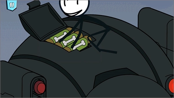 4、要是玩家没能完成五角星的绘制,就会被关入监狱。火柴人在监狱里成功越狱后,进入了机器人设备室,此时玩家可以选择将机器人打包带走,也可以选择带上怼人鸭。