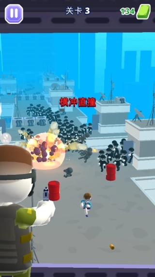 1、进入关卡中,玩家通过点击场景中追击的敌人进行射击。