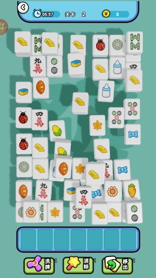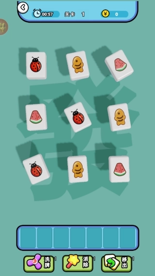 2.第一关里,玩家要在一分钟内完成瓷砖的配对消除。操作方式是点击带有相同图案的砖块,把它们放到下方区域,只要凑够三个相同图案的砖块就能消除。
