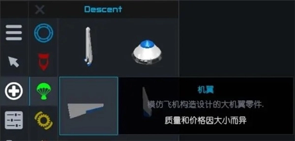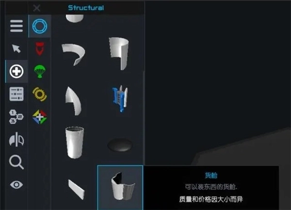 大多数用于航天飞机制造的货舱,设有三个零件接口,形状调整范围有限,不过货舱的打开角度支持自定义设置,具体调整方法可参考下文的零件高级设置页面。