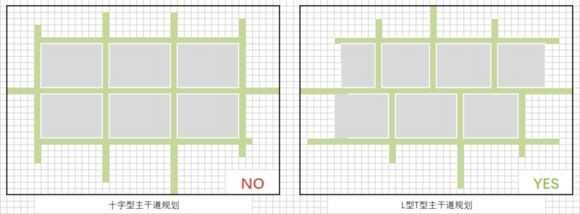 把主干道细分到最小单元,应当是众多T型与L型的道路,务必杜绝十字型道路岔口!(具体原因将在下一小节详细阐述)