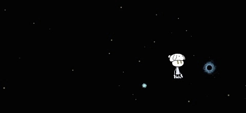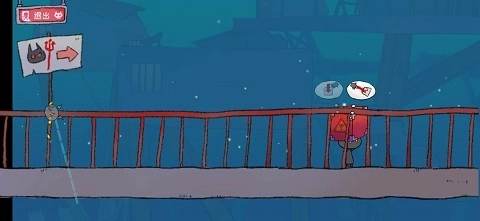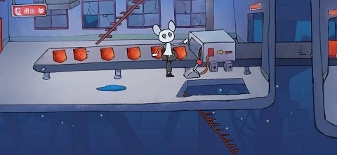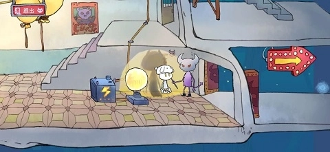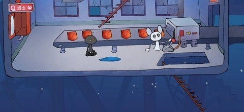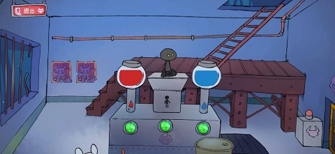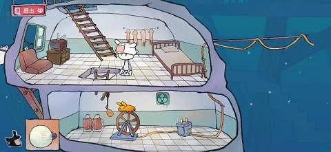进去后能看到一个正在煮饭的人,一开始可以进去捡鸡腿(不过后来似乎不让进了,这时候你需要随意把东西拖到锅那里几次,制造出水雾就能进去了)。捡完鸡腿后向右下方走拿气球,选下面第二个气球,你会发现它带有绳子。接着回到煮饭的房间,向左走把气球拖到水管处,气球就会飞起来(气球装水居然能飞?)。这时那个胖子会站起来,留下一个灯泡。拿到灯泡后,顺着他刚才坐的位置下去,把绳子拖到破楼梯上,再把鸡腿绑上去,兔子就会开始发电。之后去拿气球的地方放下灯泡,就可以去量身高了。