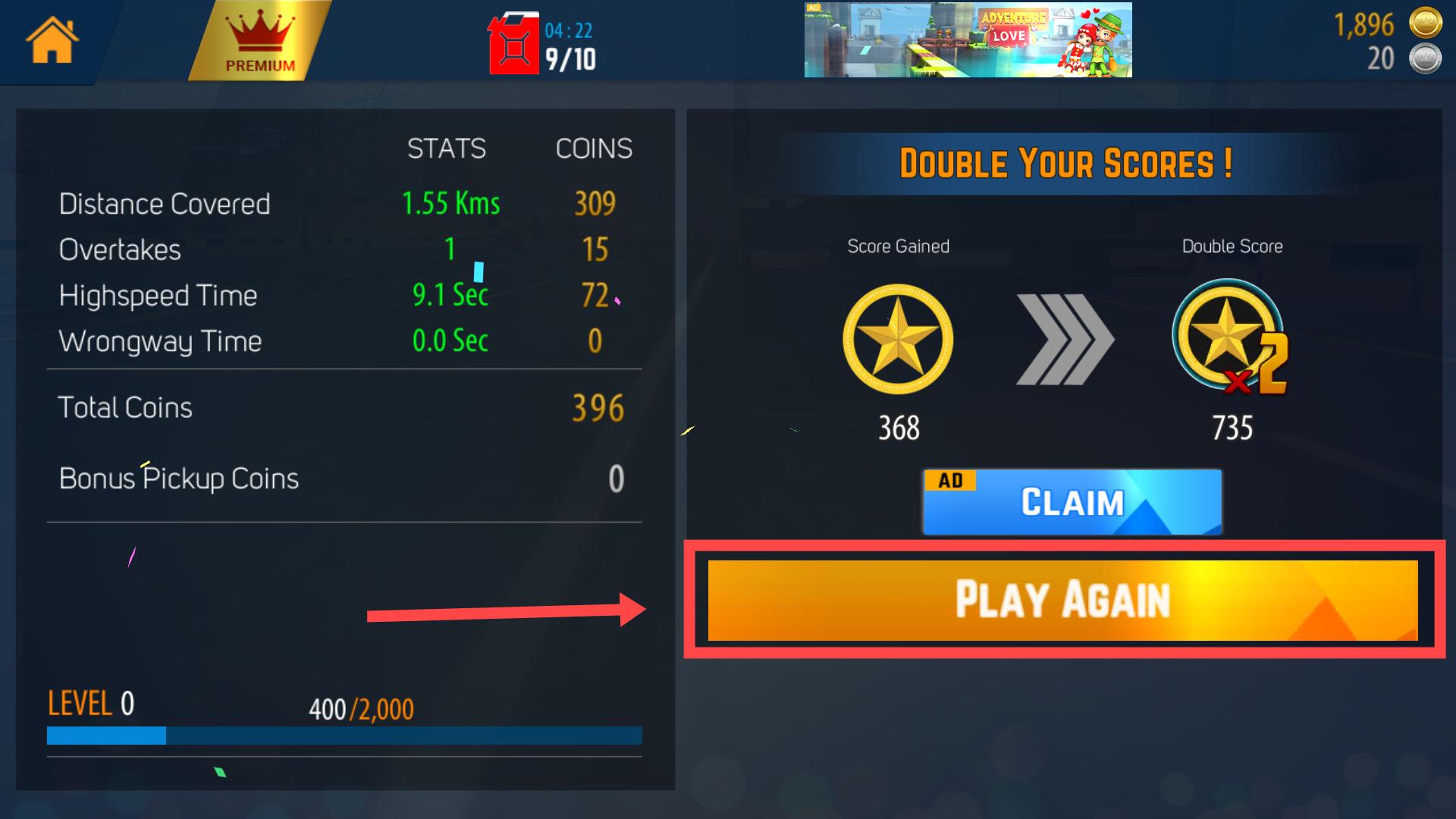3、一局结束后,根据行驶数据,点击“PLAY AGAIN”重新挑战,你可以尝试不同的驾驶策略,从而获取更高的分数与金币。