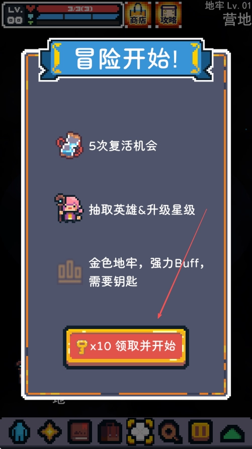 进入冒险启动页面后,先确认剩余5次复活次数,接着点击十连抽取按钮,消耗10把钥匙开启冒险流程。