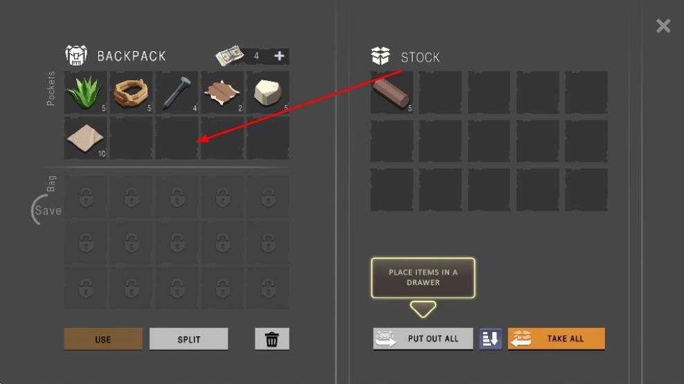 打开背包界面后,你可以查看和管理自己拥有的物品,借助USE(使用)、SPLIT(拆分)等功能对道具进行操作,同时还能从仓库中存取物品。