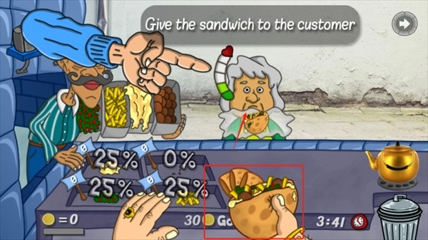 5、制作好的三明治直接点击人物,即可将三明治打包给顾客即可。