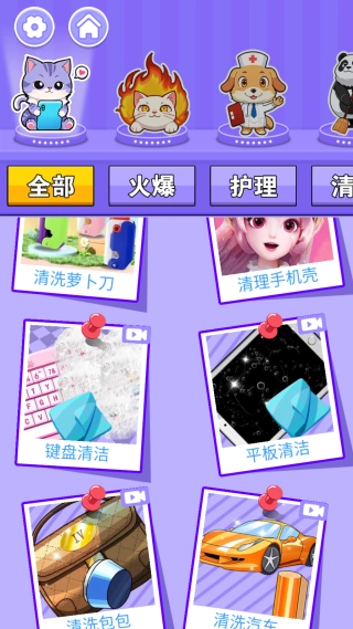 场景丰富多样,覆盖个人护理、宠物清洁、物品保养等多个领域,每个场景都配备专属清洁工具,可体验不同类型的污渍,形式多元。