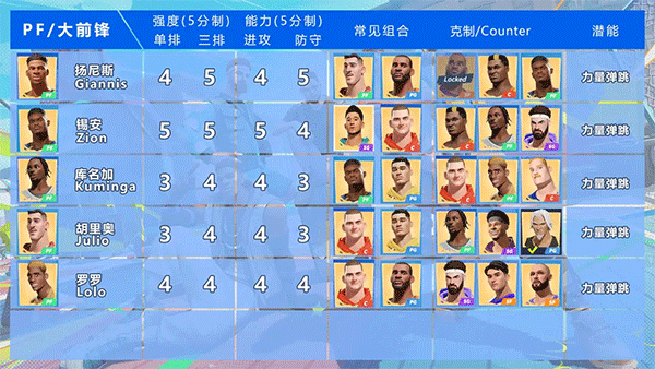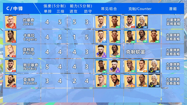 中锋位置的上手难度适中,比较适合偏爱篮下强攻、擅长身体对抗,并且在篮板球落点预判方面能力突出的球员选择。
