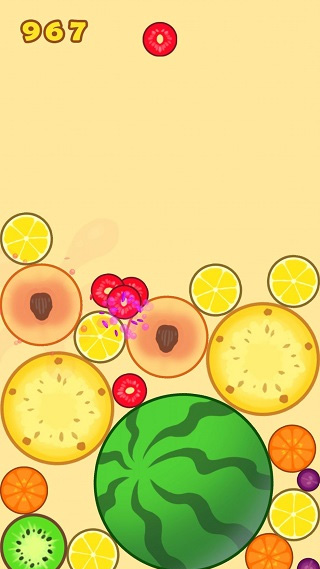 上下有序、左右有序,达成连续多次合成,借助物理碰撞机制进行插空与排挤,促使原本不相邻的水果得以接触,最终合成大西瓜。