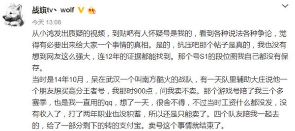 昨天,微博账号名为战旗tv丶wolf的游戏主播,在中午时分于自己的微博里写道: