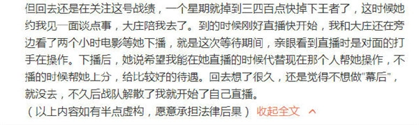 但回去后我还是忍不住关注那个账号的战绩,结果才一个星期就掉了三四百点,眼看就要掉出王者段位了。就在这时候,她约我见面谈点事情,大庄陪着我一起去了。到了地方才发现她的直播马上就要开始,我和大庄就在旁边看了两个小时的电影,等她下播。也正是在这次等待的过程中,我亲眼看到直播时其实是对面的打手在操作账号。她下播后对我说,希望我能在她直播的时候代替现在这个人帮她操作,不直播的时候就帮她上分,还说会给我不错的待遇。回去之后我想了很久,还是觉得不想做这种“幕后”的工作,就拒绝了她。没过多久战队解散了,我也就开始了自己的直播生涯。