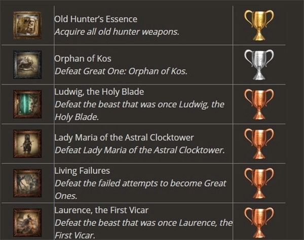 在曝光的奖杯里,第一个是“击杀《血源:老猎人》所有Boss”,剩下的五个奖杯则各自对应击杀其中一位Boss。
