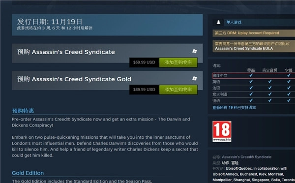 刺客信条:枭雄的PC端Steam版本提供简体中文支持。