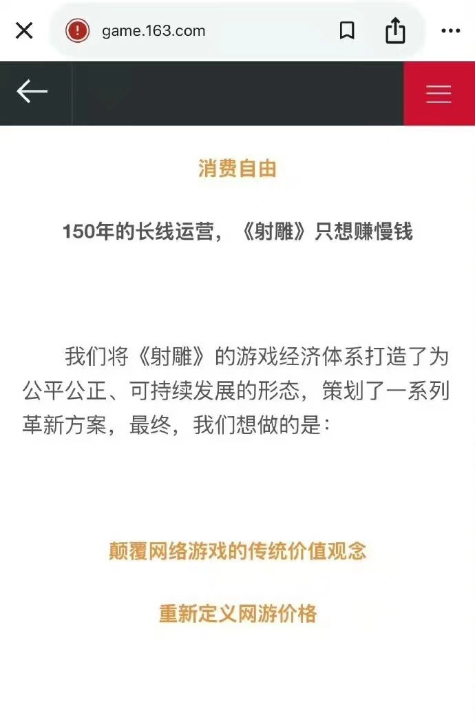我们和您一样,对《射雕》这款游戏怀有难以割舍的深厚情感,也为此次终止运营给您带来的不便,致以最诚挚的歉意!由衷感谢您的理解与包容,更期待您能继续支持和关注网易旗下其他更多优质的产品!