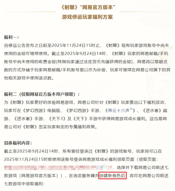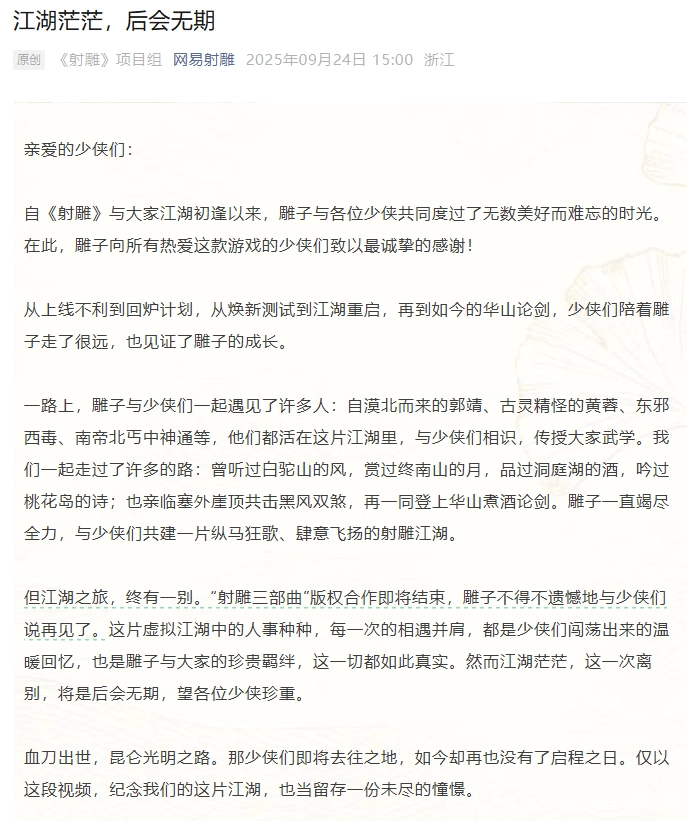 感谢您一直以来对网易《射雕》游戏的支持与喜爱!由于网易公司与明河社关于《射雕三部曲》IP的合作期限即将届满,同时结合游戏运营策略的调整,《射雕》游戏将于2025年11月24日15时停止运营,现将终止运营的相关事宜通知如下: