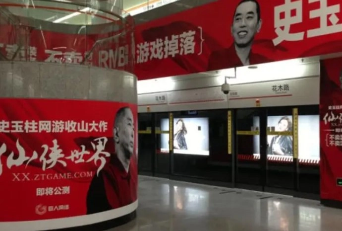巨人网络包下了展馆附近地铁站的所有户外广告位,史玉柱标志性的红色海报贴满各个角落,场面堪比 “过年办年货”。