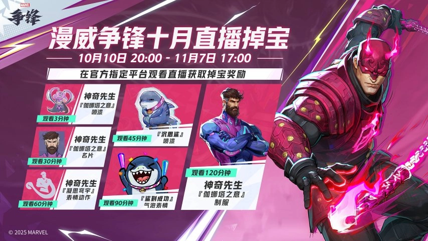 随着S4下半赛季的开启,全新的直播掉宝活动也同步上线了。大家可以前往抖音《漫威争锋》专区观看直播,只要累计观看时长达到指定要求,就能完成任务并领取神奇先生「伽娜塔之意」系列皮肤及外观装扮。值得一提的是,本次直播福利还新增了两款以陆行鲨杰夫为主题的外观!在体验新赛季精彩内容的同时,可别错过领取直播平台专属奖励的机会哦!