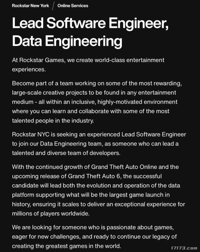 这则招聘信息针对“首席软件工程师”岗位发布,尽管该职位本身属于常规招聘范畴,不过其中关于《GTA6》的相关描述却吸引了大量关注。R星在公告里提到:“鉴于《GTA Online》的不断发展,还有《GTA6》的临近推出,最终被录用的应聘者需要负责引领和推动数据平台的升级,以此为这款史上首发规模最大的游戏提供支持。”