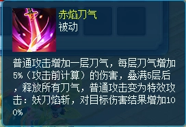 她的专属技能赤焰刀气能让每次普攻叠加一层刀气,每层刀气可提升自身5%的伤害。刀气叠满五层时,下一次普攻会变为特效攻击,伤害直接翻倍,效果十分强悍。