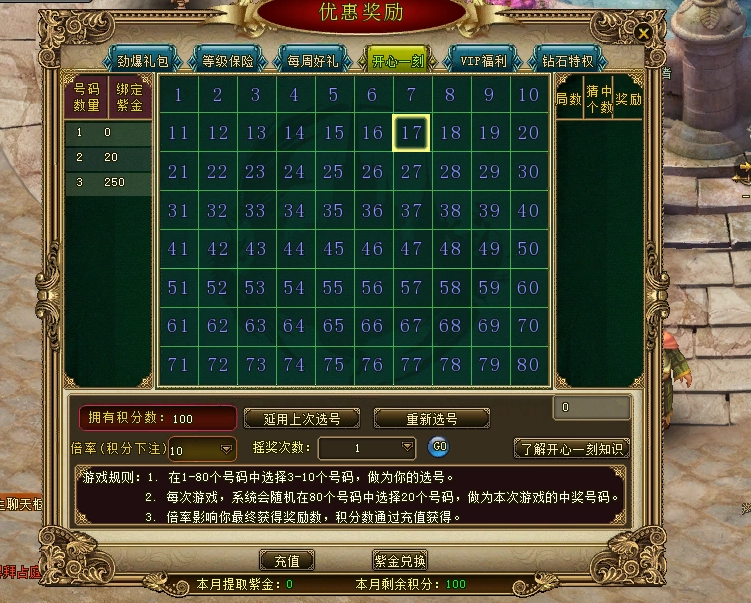 游戏界面左侧可查看猜对不同中奖号码个数所对应的奖励绑定紫金数量。你能够选择倍率,该倍率会对最终获得的奖励绑定紫金数量产生影响。游戏界面右侧可以查看当前局数中猜中的号码数量。奖励绑定紫金数量的计算公式为:基础奖励乘以倍率;每次参与游戏消耗的积分计算公式为:倍率乘以10。