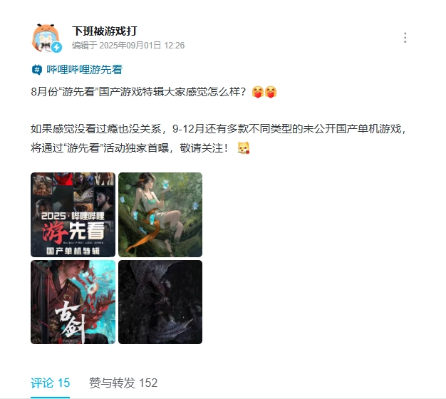 官方在动态里提到:“8月推出的‘游先看’国产游戏特辑,大家体验如何?要是觉得意犹未尽也无需担心,9月到12月期间,还会有不少不同品类的未公开国产单机游戏,通过‘游先看’活动进行独家首次曝光,欢迎大家持续关注!”