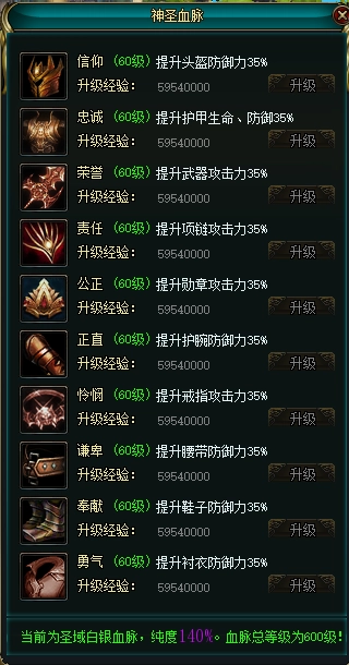 十大血脉与十大装备部位一一对应,各自以“信仰、忠诚、荣誉、责任、公正、正直、怜悯、谦卑、奉献、勇气”命名,其属性加成精准适配装备的每一处细节。每当血脉等级提升一层,对应的装备属性效果便会得到明显强化。玩家能够根据自身的职业特性和战斗风格,有重点地强化关键装备部位,从而打造出专属的个性化战斗体验。血脉升级需要消耗经验值与绑银,如何高效分配这些资源,成为了玩家面临的新一轮策略挑战。