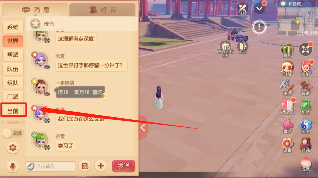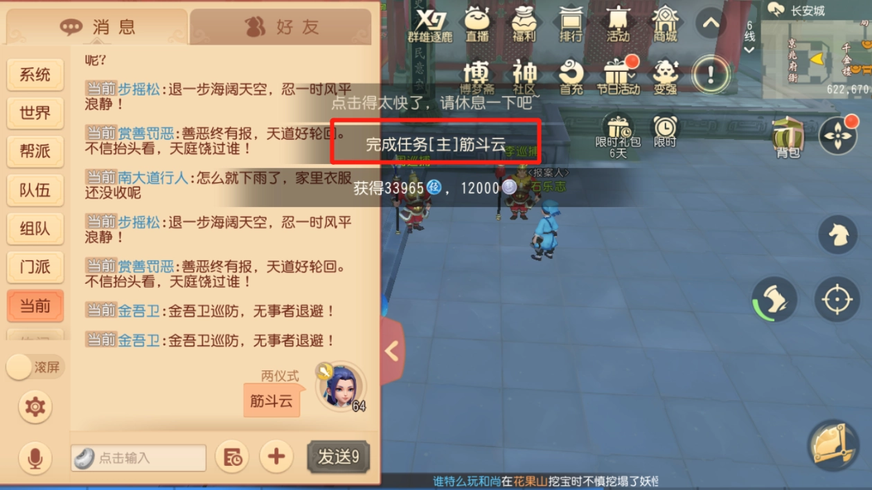 (3)完成方法:完成的方法其实很简单,大家只需打开聊天框,找到当前频道,接着输入“筋斗云”就能完成任务。